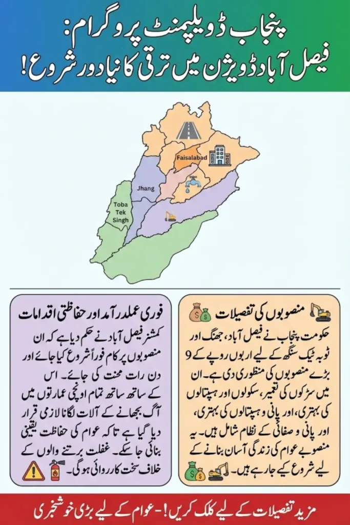 پنجاب ڈیولپمنٹ پروگرام فیصل آباد ڈویژن کے تحت صوبائی حکومت خطے میں نو بڑے ترقیاتی منصوبے شروع کرنے جا رہی ہے، جس سے عملی مرحلے کا باقاعدہ آغاز ہوگا۔ ان منصوبوں کا مقصد فیصل آباد، جھنگ اور ٹوبہ ٹیک سنگھ میں بنیادی ڈھانچے کو مضبوط بنانا اور عوامی سہولیات کو بہتر بنانا ہے، تاکہ مقامی آبادی کو براہِ راست فائدہ پہنچ سکے۔